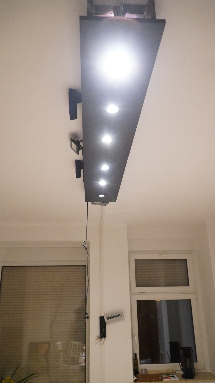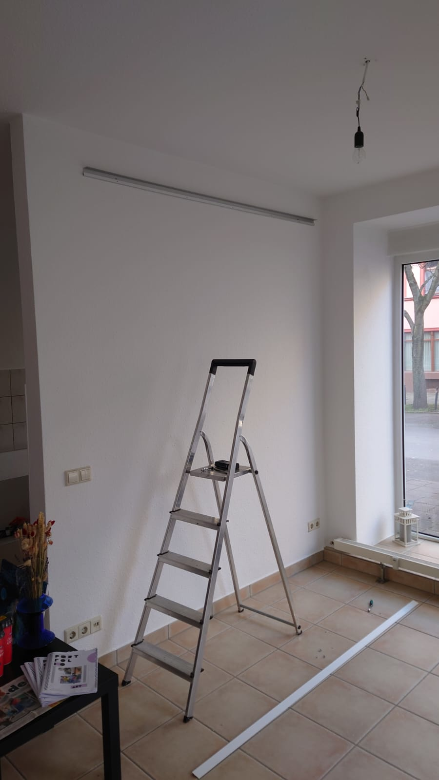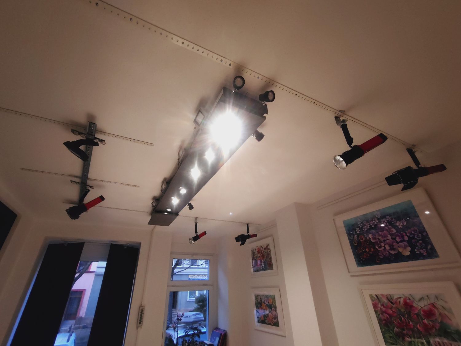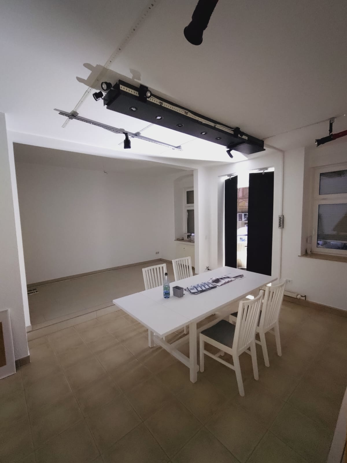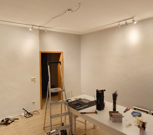 Installation des Spotträgers im Fotostudio. Weiterführung der Malerarbeiten. Planungen für die Beleuchtung des Schulungsraumes. |
