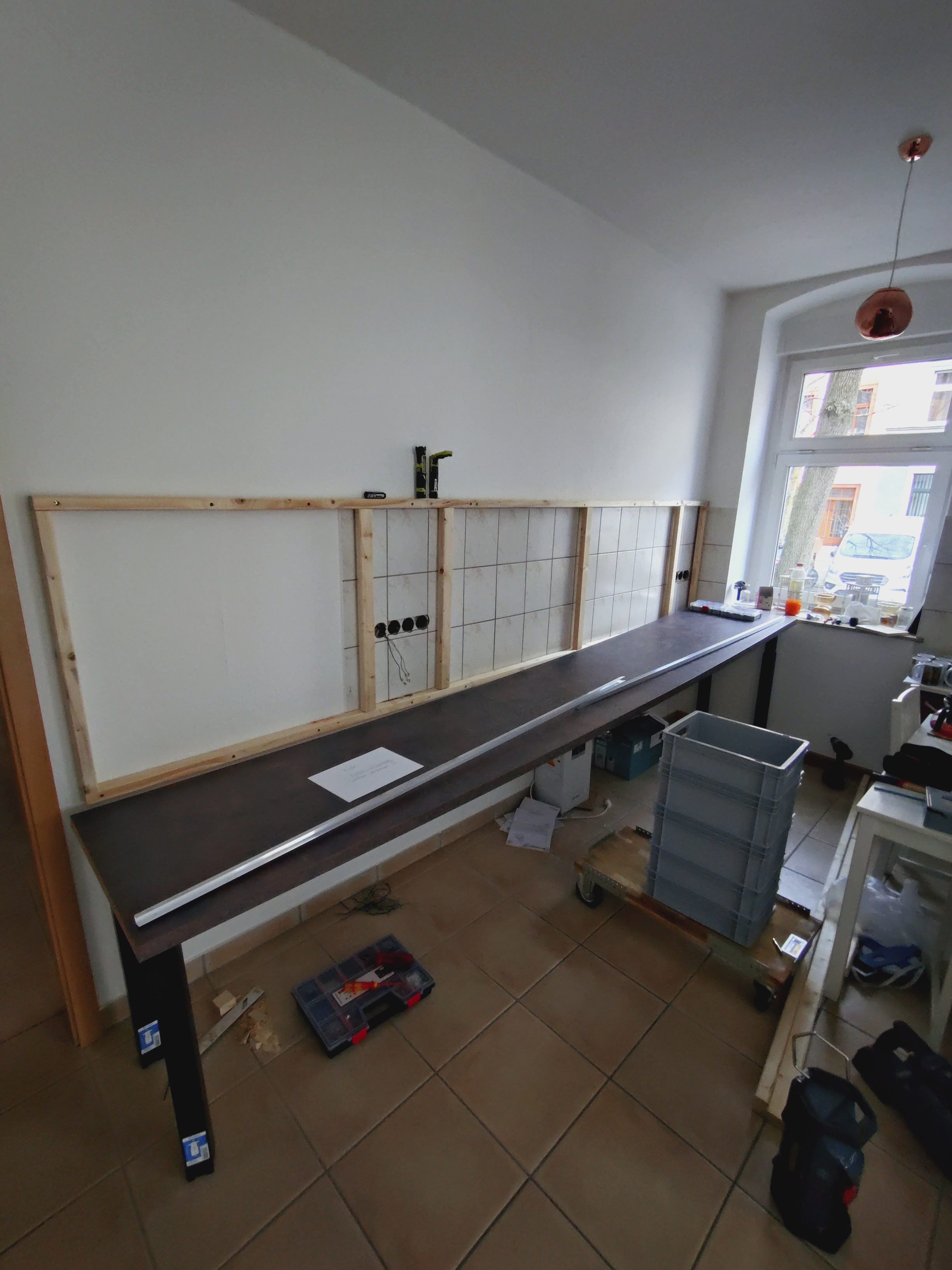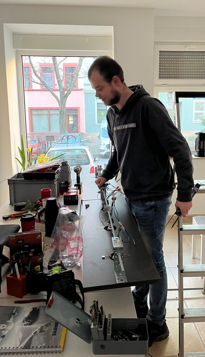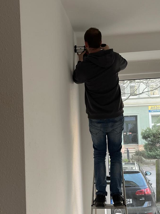 Installation des Tasterfeldes des Spotträgers im Fotostudio. Weiterführung der Malerarbeiten. |